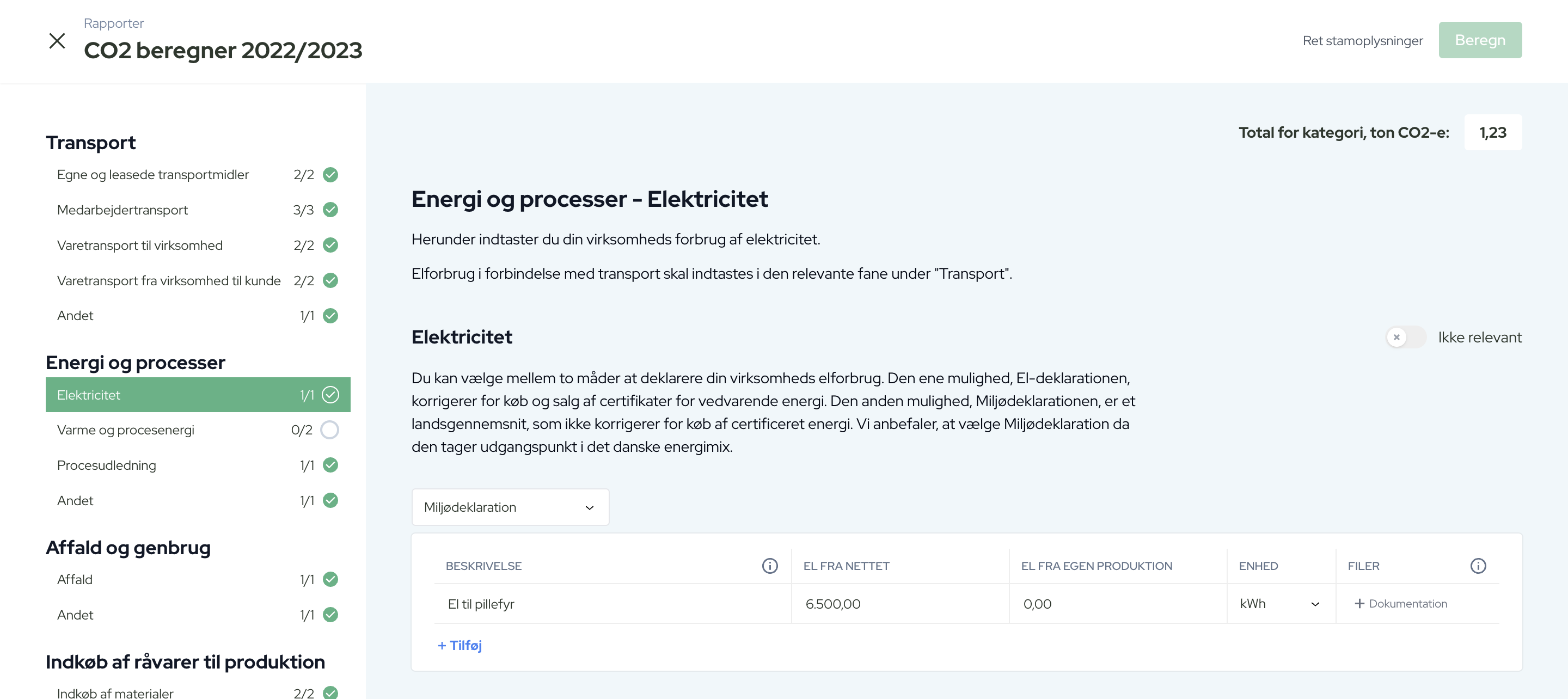 I Valifieds CO2 beregner kan I under menulinjen Energi og processer i venstre side, her kan du under fanen elektricitet tilføje den elektricitet der bruges på at holde pillefyret kørende. Det kan være en god idé at knytte en kommentar om at netop dette forbrug vedrør sig pillefyret, så der er et godt overblik. Eksempelvis: